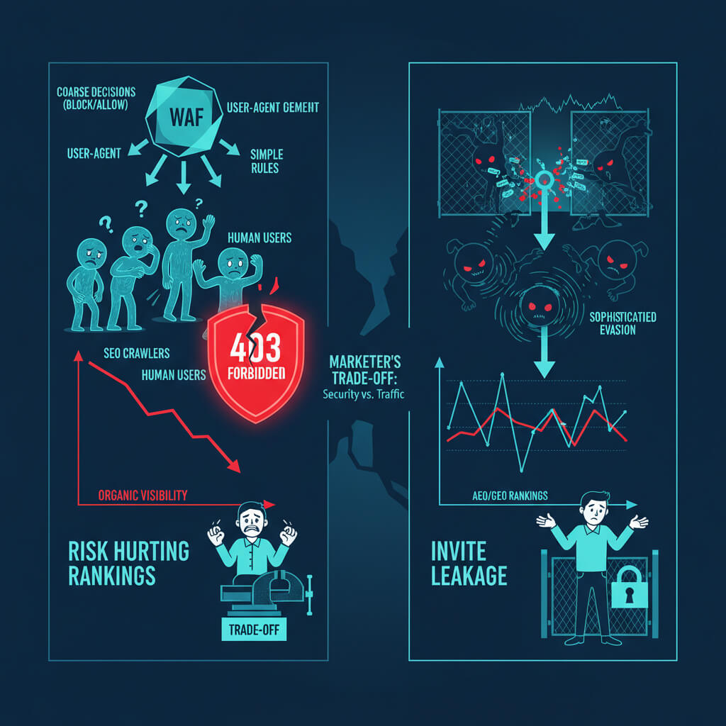 WAFs typically force coarse decisions: block or allow based on IP, user-agent, or simple rules. That either annoys real users (false positives) or leaves blind spots (sophisticated evasion). Marketers end up with a painful trade-off: protect the site and risk hurting rankings or open up and invite leakage.